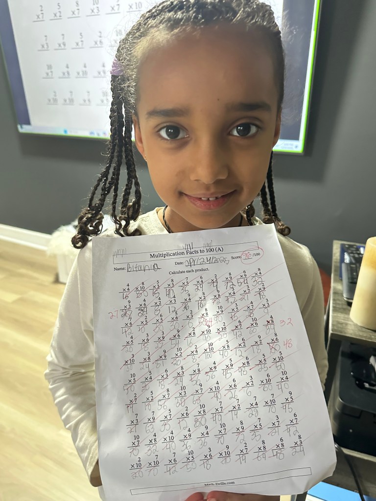 One of my brilliant first grade students just completed a 100-item multiplication drill… and scored an amazing 96 out of 100! 🎉