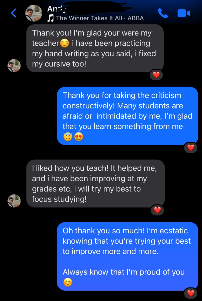 “Teacher Kreix made learning English so fun and easy. She helped me improve my pronunciation and grammar when I was in middle school. I’m more fluent now and I’m not afraid to speak English anymore!”